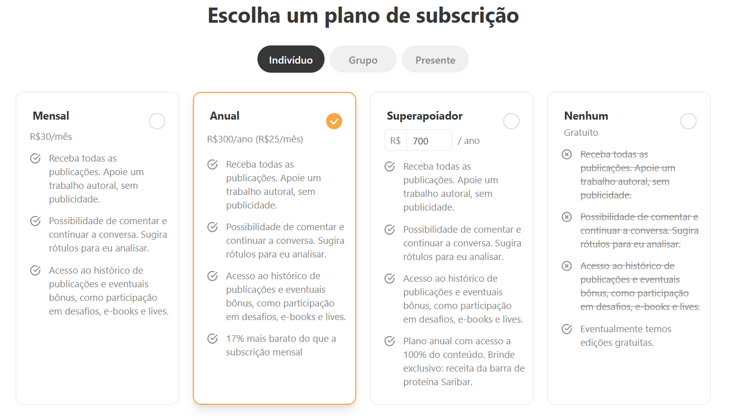 Planos: assinaturas recorrentes no valor de R$ 30/mês ou R$ 300/ano (com desconto no valor mensal); superapoiadores podem dar um apoio extra por R$ 700/ano.
