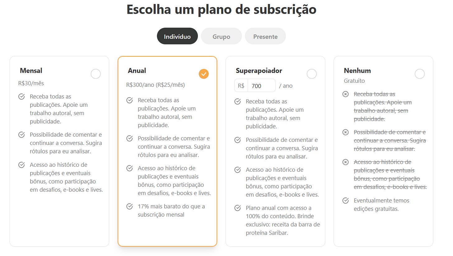 Ao assinar um plano pago, você ganha acesso imediato a todo o arquivo de publicações passadas e passa a receber as novas publicações por e-mail (e/ou pelo app Substack). Eventualmente, envio versões gratuitas para todos.