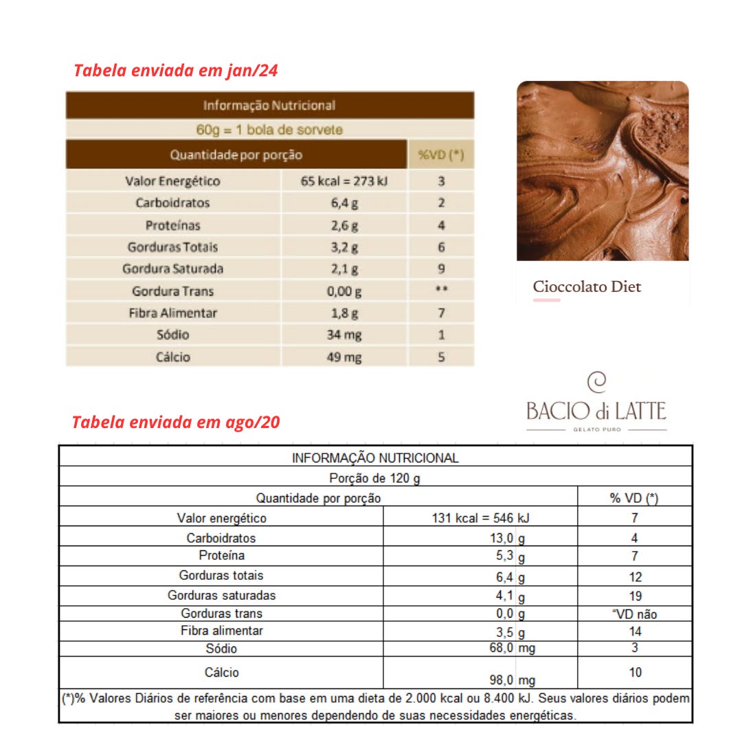 No último semestre, tentamos diversos contatos com o fabricante Bacio Di Latte solicitando informações sobre seu sorvete de chocolate diet. Infelizmente, eles se recusaram a informar a lista de ingredientes, alegando que não poderiam fornecer a informação, pois o produto não é vendido embalado, ele é servido em frente ao consumidor. A resposta foi mais ou menos assim: