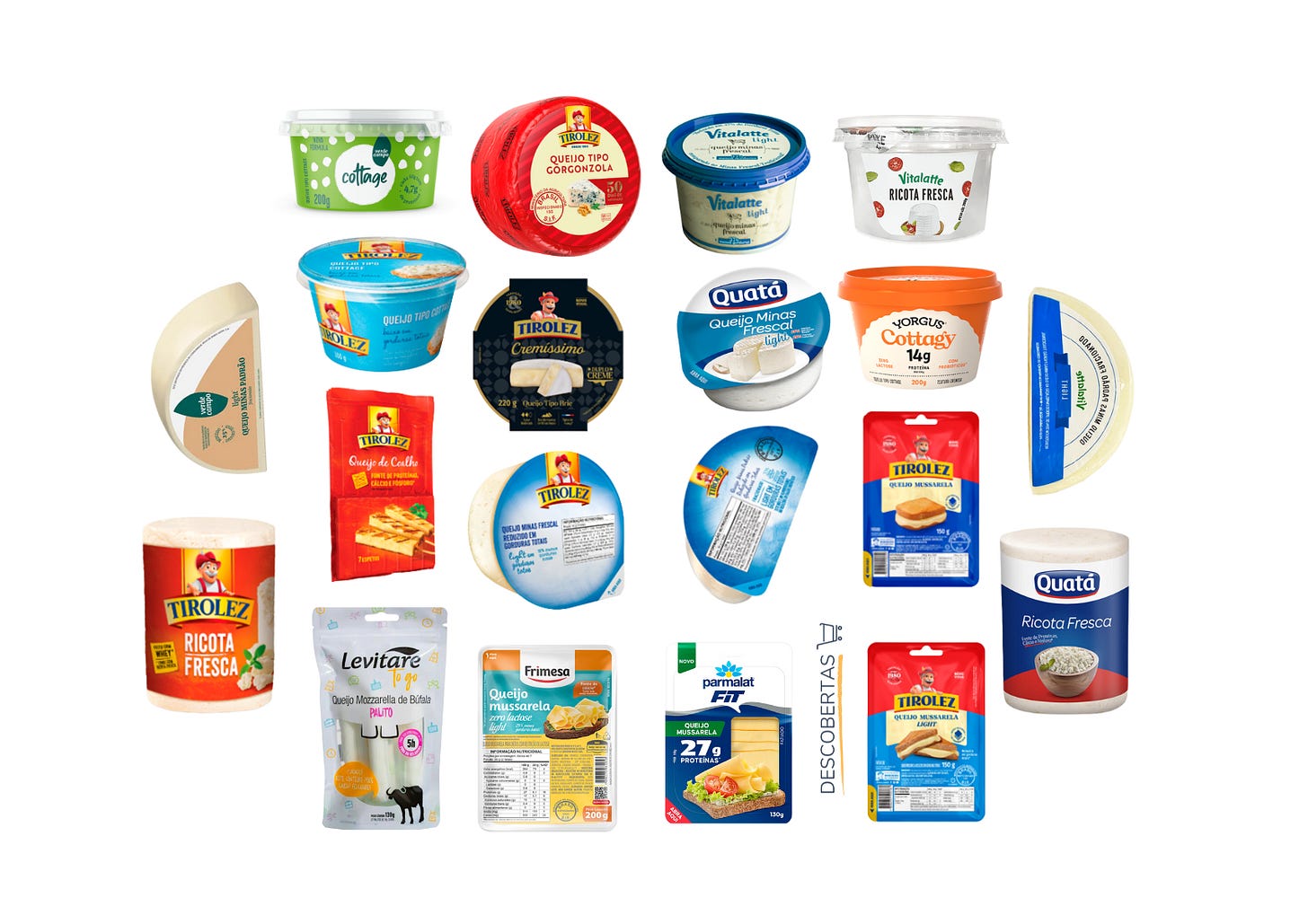 Guia visual com uma seleção de várias marcas de queijos com maior teor de proteínas.