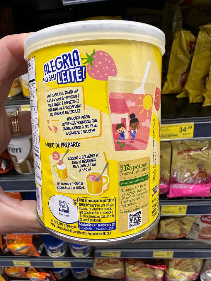 Você já parou pra pensar no que tem dentro das latas de alimentos infantis? Na mesma prateleira do supermercado, de um lado encontrei o Nesquik sabor morango — “alegria no seu leite”. De outro, os complementos alimentares Nutren Kids e Sustagen Kids, que prometem imunidade e nutrição completa. Embora a comunicação das marcas indique algumas diferenças entre esses produtos, existem pontos em comum: